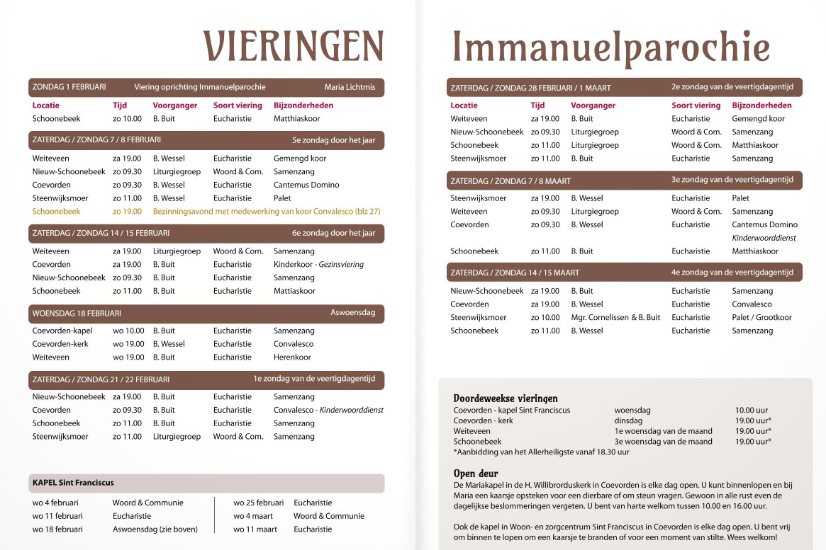 Rooster van vieringen in de Immanuelparochie - tot en met 15 maart 2026