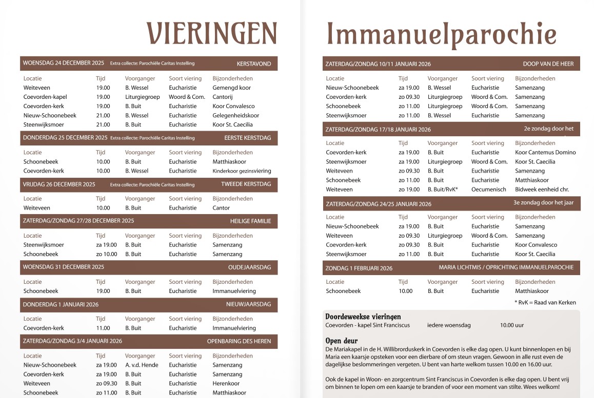 Rooster van vieringen in de Immanuelparochie tot en met 1 februari 2026