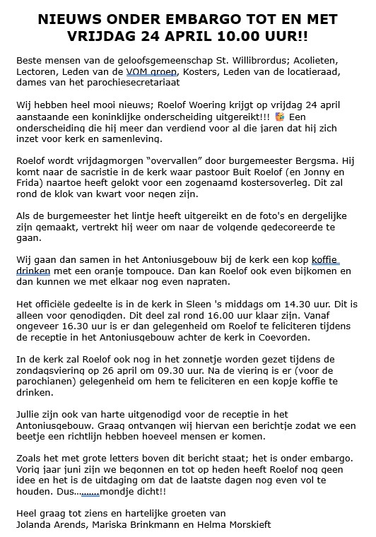 Roelof Woering krijgt op vrijdag 24 april aanstaande een koninklijke onderscheiding uitgereikt!!!