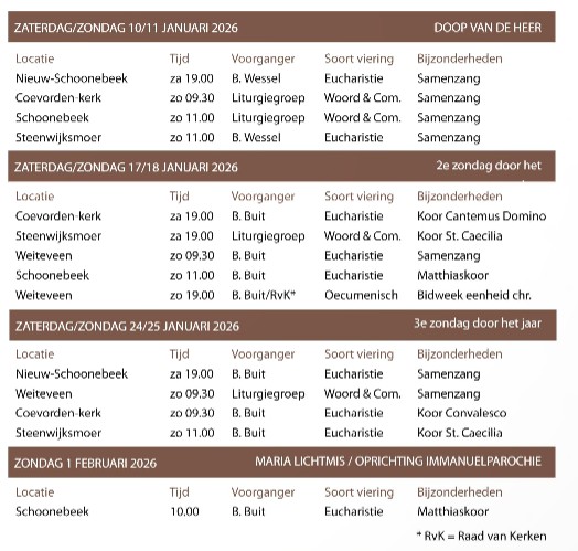 Rooster van vieringen in de Immanuelparochie tot en met 1 februari 2026