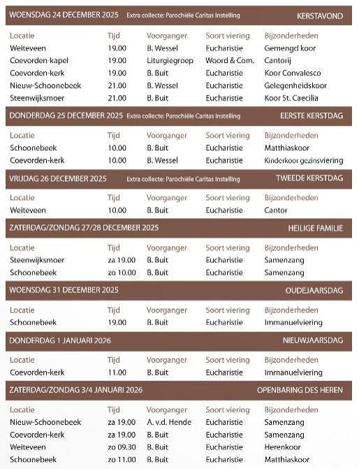 Rooster van vieringen in de Immanuelparochie tot en met 4 januari 2026