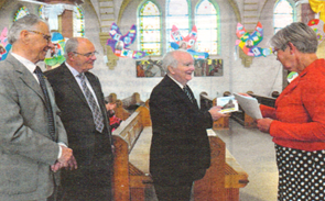Om twaalf uur boden Jan Tichelaar en Marietje Blaauwgeers-Suelmann van de Werkgroep Liturgie ere-pastoor Gerard Lukassen, schrijver Rein Veldhuizen en drukker Chris Leijendekker de eerste drie exemplaren van het boekje ‘100 jaar H. Willibrorduskerk' aan, waarmee de derde etappe in de viering van het eeuwfeest werd afgesloten.